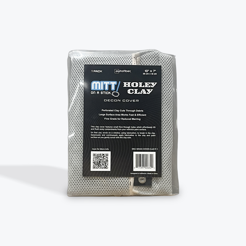 Autofiber's Mitt On A Sick is a specialized clay decontamination cover engineered for professional detailers. The holey design maximizes surface contact while reducing friction, allowing the clay to glide smoothly across paint without marring. This innovative texture accelerates the decontamination process by breaking up bonded contaminants more efficiently than traditional solid clay mitts. Ideal for removing industrial fallout, brake dust, and embedded particles before polishing or coating applications. Compatible with standard clay lubricants and delivers superior results on heavily contaminated finishes.